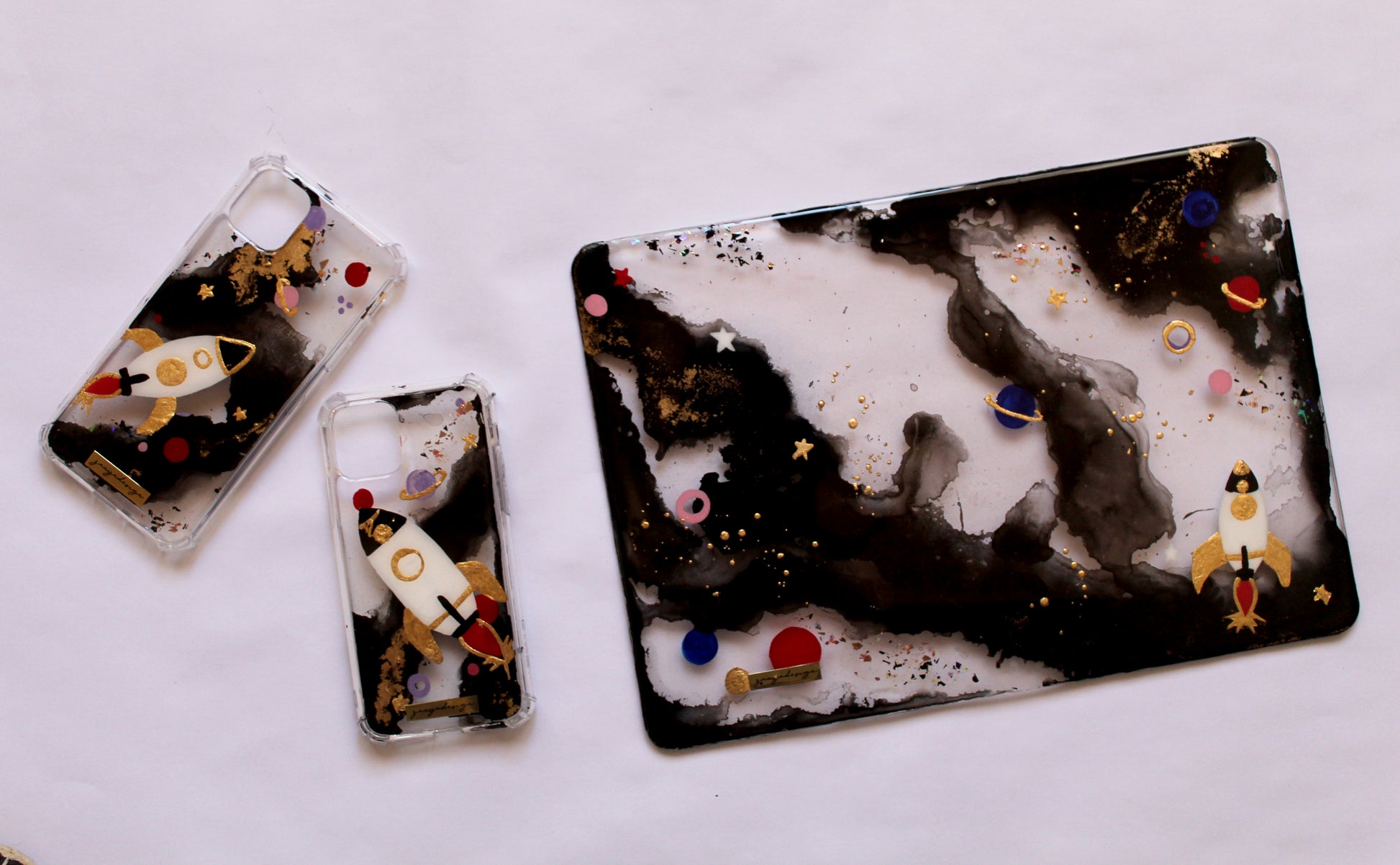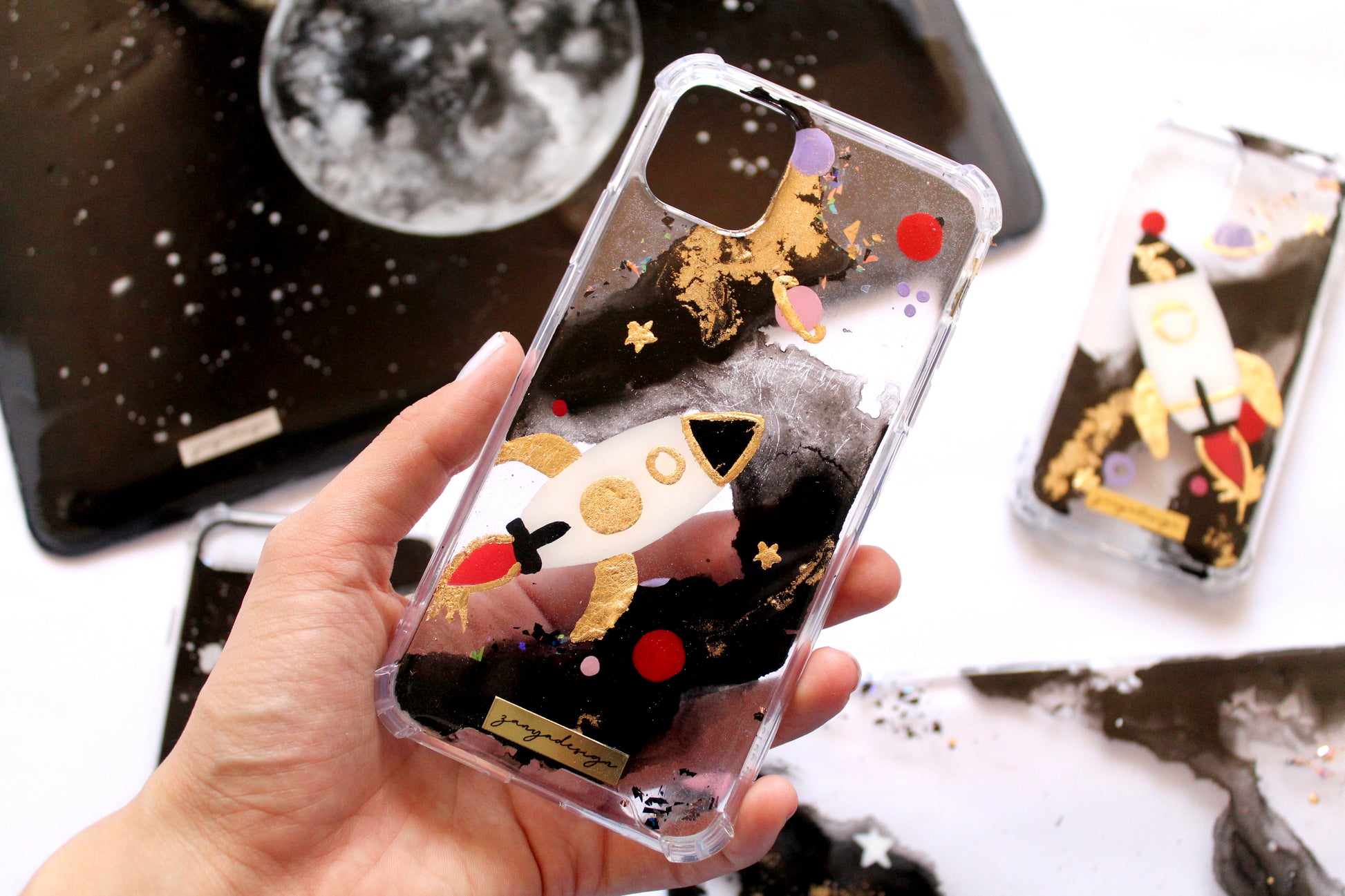 Diseño nave espacial. Fondo negro, detalles a colores, oro y brillos tornasolados.